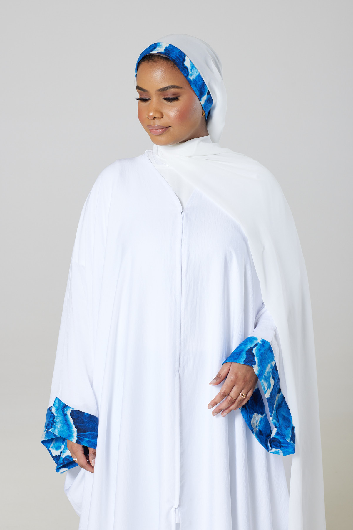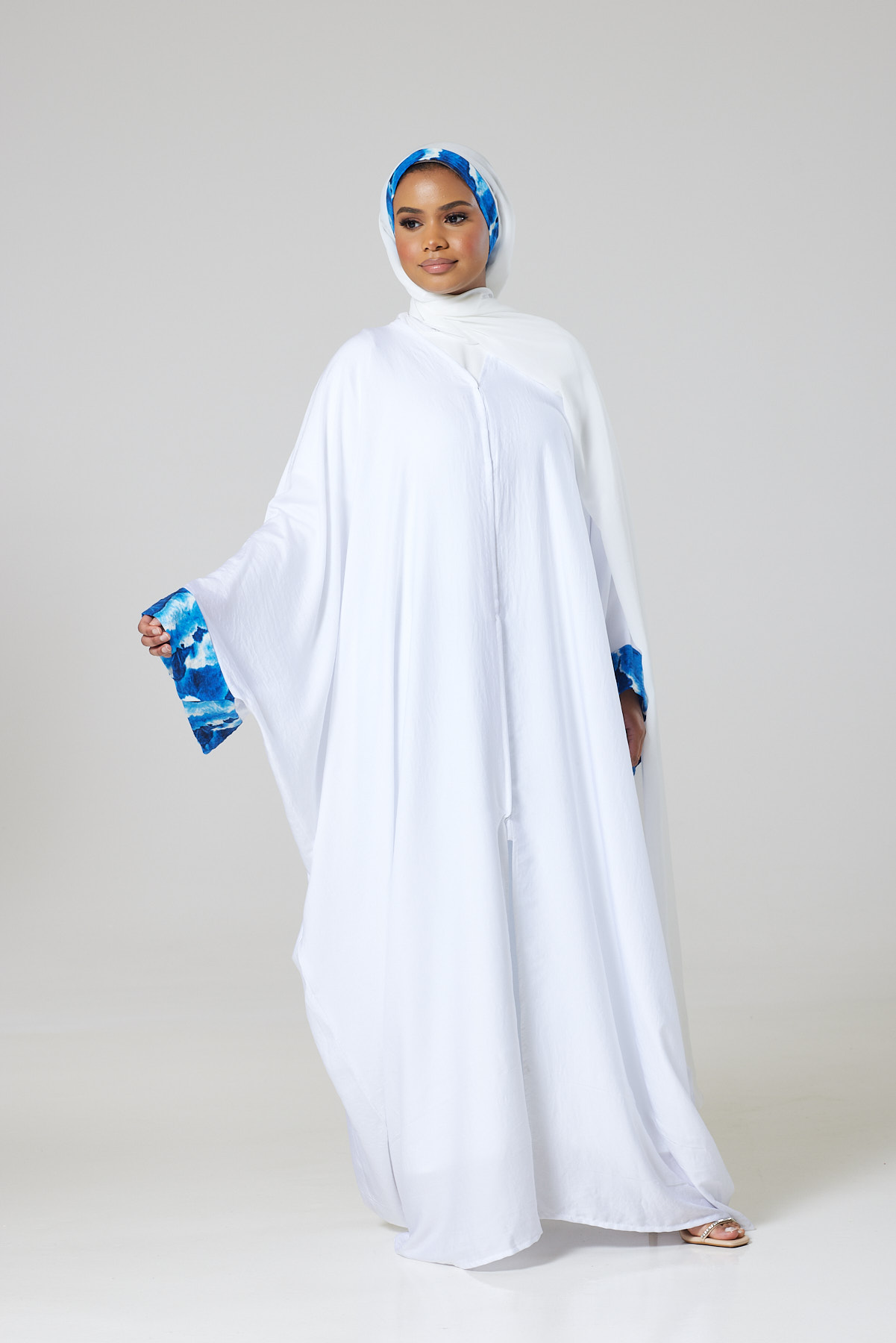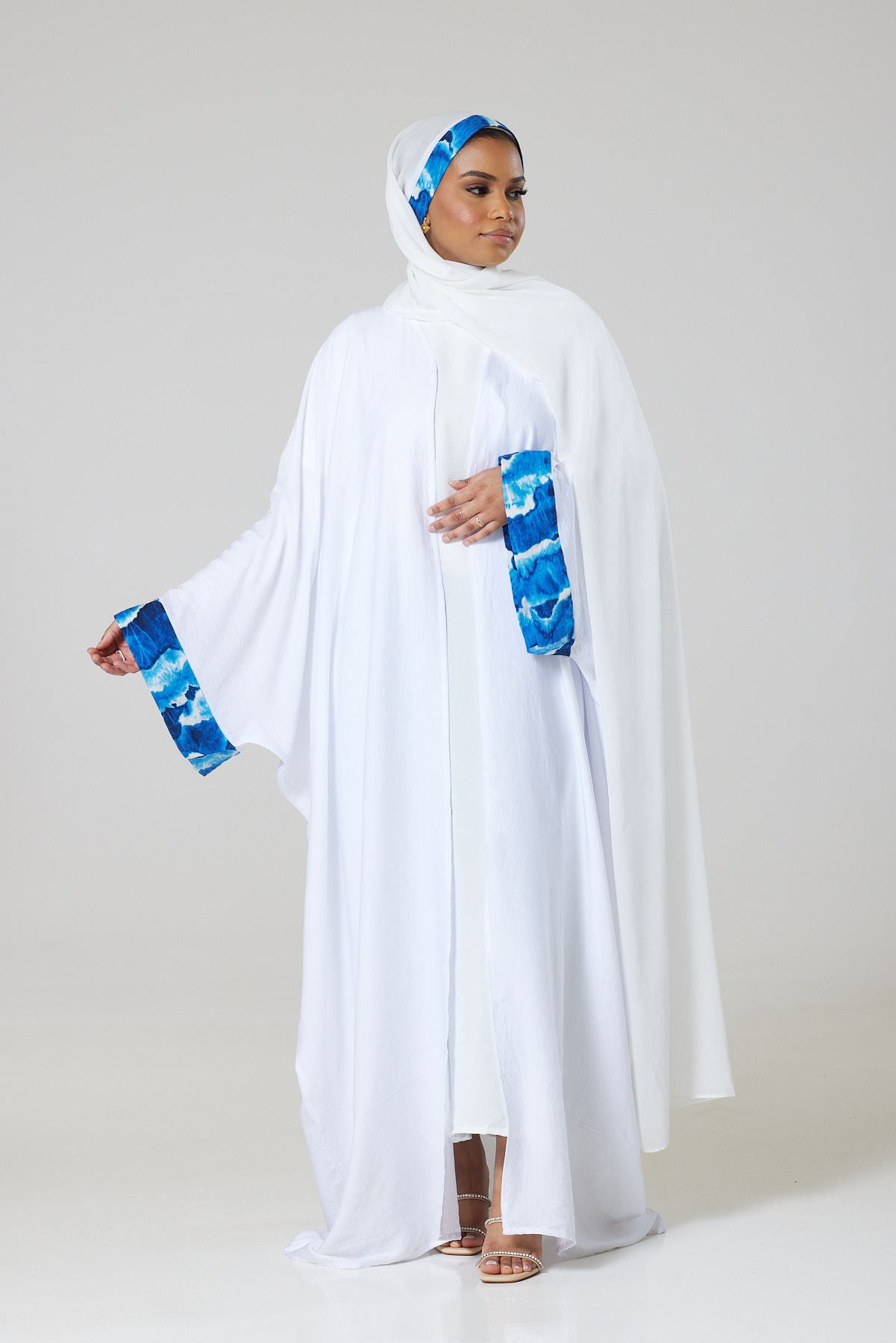 If you’re looking for an elegant yet subtle piece than this Abayah is the one for you. A beautiful oversized design with a pop of colour on the sleeves, this Abayah is the definition of classy. Comes with a matching white slip dress to complete your look.